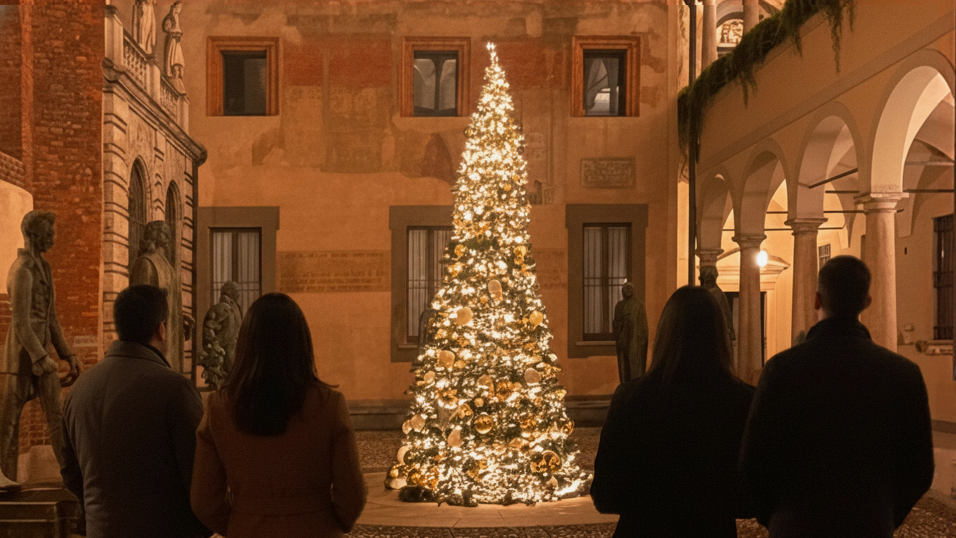 Alle 18.30 il Cortile degli Spiriti Magni apre le sue porte e vi accoglie con una visione davvero suggestiva: il grande albero di Natale, le luci che decorano i loggiati e il fascino senza tempo dell’architettura creano un ambiente perfetto per cominciare la serata.